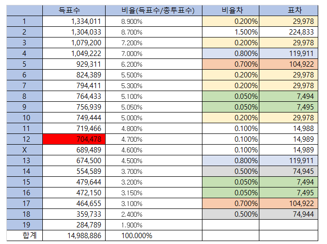 위 표는 바로 어제 방송된 파이널 생방송 투표수인데요, 비율 항목을 보시면 정확히 0.05%로 끊어지는 것을 아실 수 있습니다. 어떻게 해서 이렇게 정확히 떨어질 수가 있을까요? 때문에 많은 네티즌들은 원본 데이터가 아닌 가공이 된 데이터라고 확신을 하고 있는습니다. 저 역시도 그렇게 생각되는데요, 순위가 임의로 조작된지는 모르겠지만 투표수는 엠넷의 해명이 없는 한 논란이 될 수 밖에 없는 것 같습니다. 중간에 보시면 12등에서 0.02%가 등장하는데요, 12등의 득표수 704,748에서 7과 4의 자리를 바꾸어 704,478로 바꾸면 이 역시 0.005%가 된다고 합니다.
