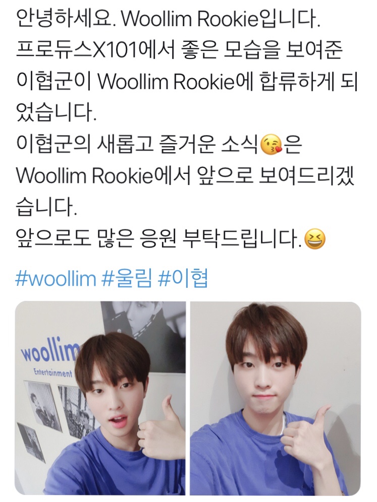 여러분 안녕하세요, 선호의 아이돌채널입니다. 오늘은 기분 좋은 소식을 하나 알려드리려고 합니다. 바로 프로듀스 X 101에 출연하였던 자칭 타칭 메인보컬 이협이 울림 엔터테인먼트에 합류를 하게 되었다고 합니다. 사실 이것은 오늘 공개된 것은 아니구요, 며칠 전 울림 루키 공식 SNS를 통해 공개된 내용입니다. 제가 그 내용을 캡쳐해봤는데요, 아래 함께 보시도록 할게요.
