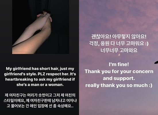 솜혜인은 자신의 인스타그램에 '제 여자친구는 머리가 숏컷이고 그저 제 여친의 스타일이에요, 제 여자친구한테 남자냐고 여자냐고 물어보는 건 애인 입장에선 좀 속상해요..' 라는 말을 남겨 모두에게 자신에게는 여자친구가 있다고 당당하게 밝혔죠. 사실 커밍아웃을 한 것은 며칠전이었는데 이제서야 이게 화제가 되었더라구요. 인스타 게시글에는 자신의 여자친구와 손을 잡은 사진이 함께 게시가 되었습니다.