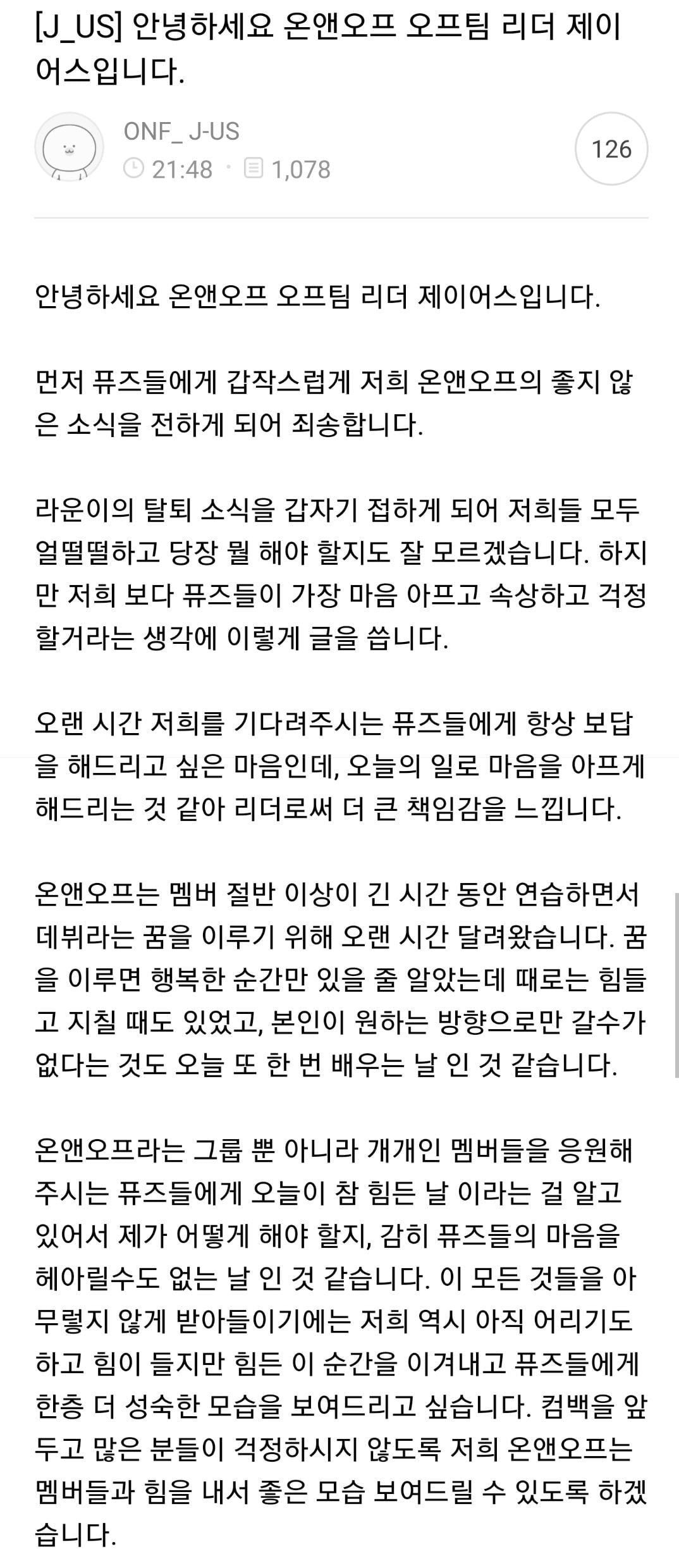 라운의 소속사였던 WM엔터테인먼트가 라운의 탈퇴를 공식화 하기 얼마전까지 라운은 웹드라마 통통한 연애2를 촬영했었고, 그 전주에는 아육대 녹화에 참여했었습니다. 그리고 3일 전에는 그룹 컴백 티저가 나왔었고, 또 1시간전에는 다른 멤버들이 브이라이브를 통해 팬들과 소통을 했었습니다. 그리고 라운의 탈퇴 기사가 나오게 된 것이죠. 이것만으로도 팬들이 의문을 가지기엔 충분했는데요, 온앤오프의 리더인 제이어스가 아래와 같은 글을 씀으로써 그 의문은 더 증폭될 수 밖에 없었습니다.