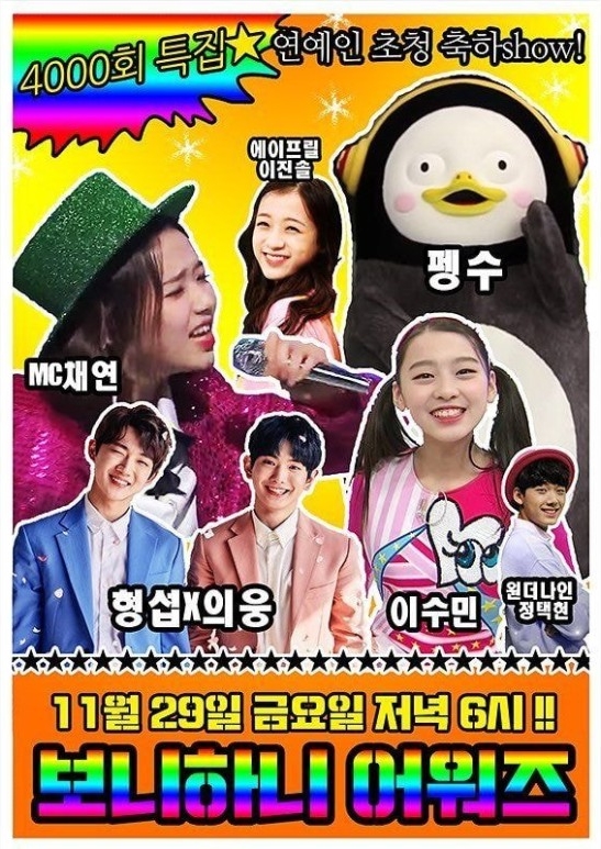 먼저 현재 하니를 맡고 있는 버스터즈의 채연이 MC를 보게 되었구요, 현재 보니를 맡고 있는 형섭X의웅의 이의웅은 안형섭과 함께 출연을 하게 되었습니다. 여기에 이전에 하니를 맡았었던 에이프릴의 진솔과 보니를 맡았었던 원더나인의 정택현까지 의리를 지켜준다고 합니다. 또 대박인것은 보니하니의 역대급 전성기를 이끌어냈을 당시 하니였던 이수민, 그리고 어른들의 뽀로로, 펭수까지 함께한다고 하는데요, 정말 볼만할 것 같아요.