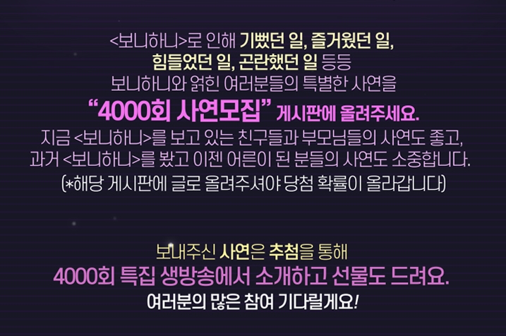 또한 보니하니에서는 4,000회를 맞이해서 사연모집도 하고 있다는데요, 관심있는 분들은 공식 홈페이지를 통해 자세한 내용을 확인하실 수 있으십니다. 오는 11월 19일 금요일 보니하니 4,000회가 90분 생방송으로 진행된다고 하는데요, 저도 한 번 옛날 생각하면서 시청해볼까 합니다. 오늘 소식은 여기까지입니다. 다음에 더 좋은 소식으로 돌아올게요. 감사합니다.