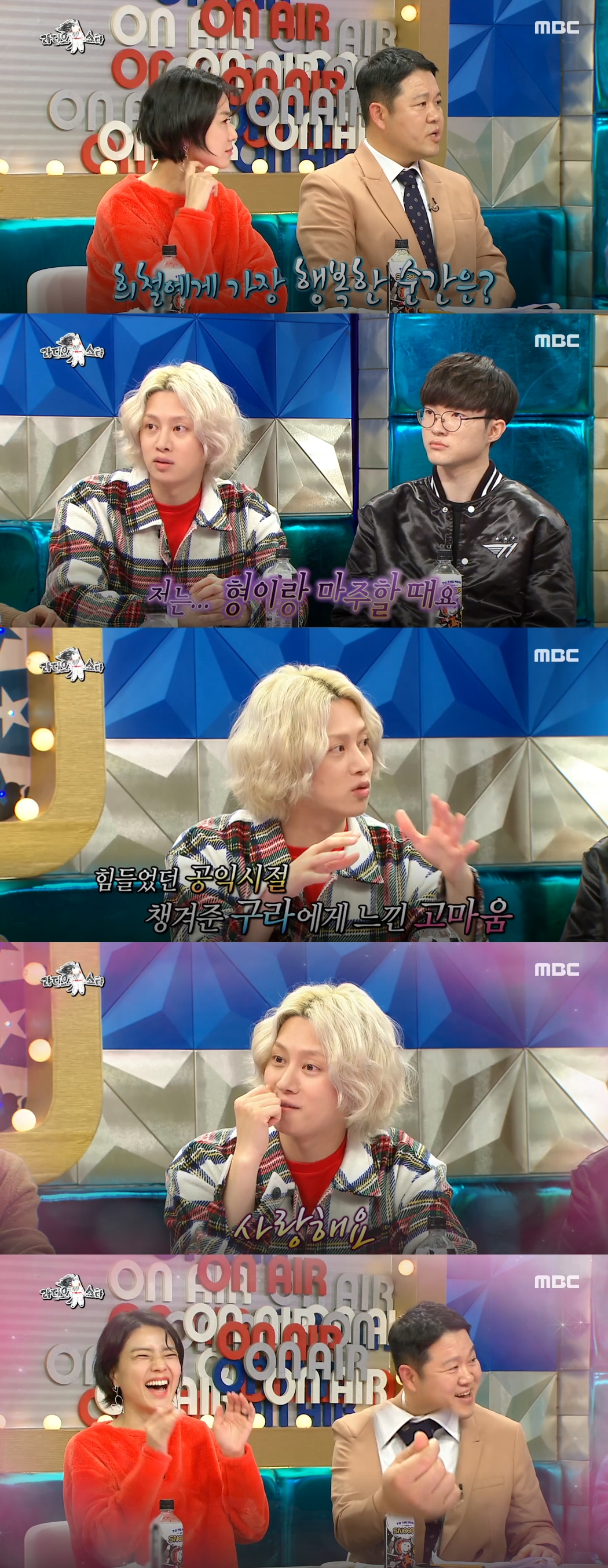 캡쳐 이미지를 간략히 설명해드리자면, 토크를 하다가 김구라가 김희철에게 가장 행복한 순간이 언제냐고 물었던 것인데요, 여기에 김희철은 김구라와 마주할 때라고 했습니다. 농담이 아니라 힘들었던 공익시절 챙겨준 김구라에게 느낀 고마움 때문이라고 하네요. 이어 김희철은 김구라에게 사랑해요라는 말까지 했는데요, 김구라는 그런 김희철의 말에 손하트로 답을 해주었습니다. 방송인들이 얼마나 동료를 아끼는지 알 수 있는 부분이었던 것 같습니다.