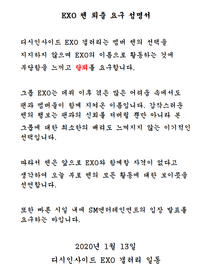 안녕하세요, 선호의 아이돌채널입니다. 인기 보이그룹 멤버, EXO의 첸이 지난 13일 자신의 인스타그램을 통해 자필 편지를 올리며 결혼을 발표했었습니다. 내용중에는 여자친구의 혼전임신 소식까지 암시적으로 전하여 팬들은 물론 네티즌들을 모두 당황하게 했었죠. 이내 팬들은 지지파 탈퇴파로 양분했는데요, 대립은 심화되었고 EXO 갤러리에서는 마침내 다음과 같은 퇴출 요구 성명서를 발표하기에 이르렀습니다.