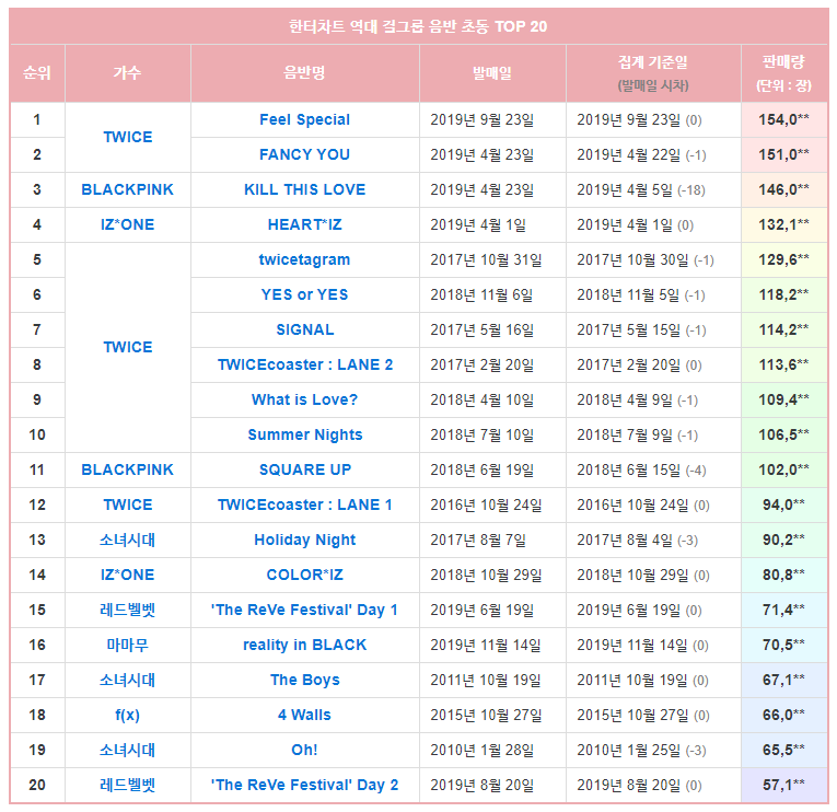 그 수치가 대체 얼마길래 그러냐구요? 디데이를 7일 앞둔 오늘 15시 기준으로 무려 13만 9천장입니다. 이 수치는 아이즈원의 이전 앨범 하트아이즈 예약판매 기록의 거의 2.5배이며, 하트아이즈 초동 기록은 깬 상황입니다. 더욱 놀라운 것은 현재 걸그룹 초동 기록 4위와도 맞먹는 수치라는 것인데요, 현재 1위로 자리잡고 있는 트와이스 Feel Special과도 1만 5천장 밖에 차이나지 않습니다.