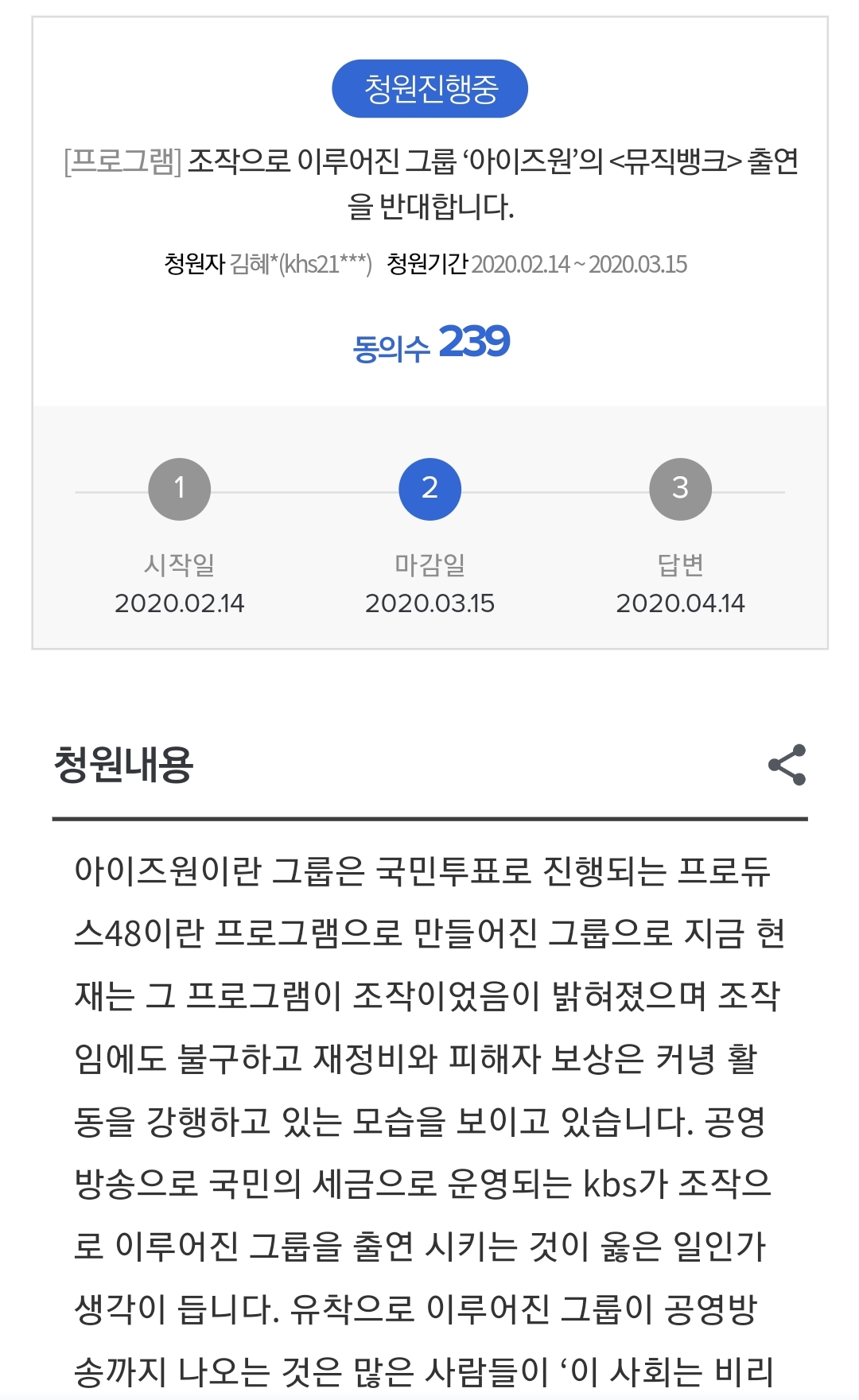 바로 '조작으로 이루어진 그룹'아이즈원'의<뮤직뱅크>출연을 반대합니다'라는 제목으로 말이죠. 이들은 내용으로 조작으로 이루어진 아이즈원이 피해자 보상은 커녕 활동을 강행하고 있다고 말하고 있는데요, 여기서 왜 아이즈원에게 죄를 묻고 있는지 이해가 가지 않네요. 조작은 아이즈원이 아닌 다른 사람들이 했는데 말이죠. 만약 뮤직뱅크가 이른 인식하여 아이즈원의 컴백을 철회하게 된다면 논란은 더욱 가중될 것으로 보입니다.