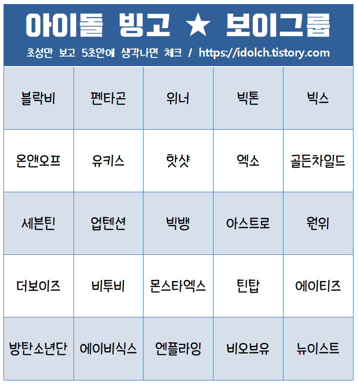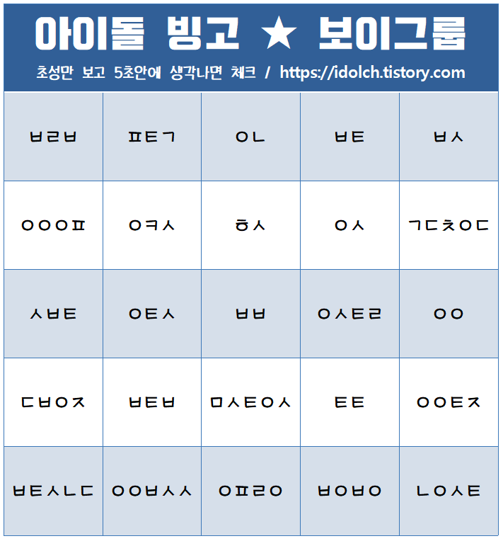 안녕하세요, 선호의 아이돌채널입니다. 오늘은 여러분들께 재밌는 컨텐츠를 소개해드리려고 하는데요, 바로 K-POP 아이돌 덕력 테스트, 아이돌 빙고입니다! 저희가 잘 알고 있는 빙고있잖아요? 제가 그 빙고판에 K-POP 아이돌들을 넣어봤습니다. 그냥은 아니고요, 초성으로요! 초성을 보시고 5초안에 그룹명이 생각나면 O표, 아니면 X표 해주세요! 과연 여러분들은 몇 빙고나 나올것 같으신가요? 버전은 총 2개로 보이그룹 버전 하나, 걸그룹 버전 하나입니다. 당신의 덕력 지금 테스트해보세요!