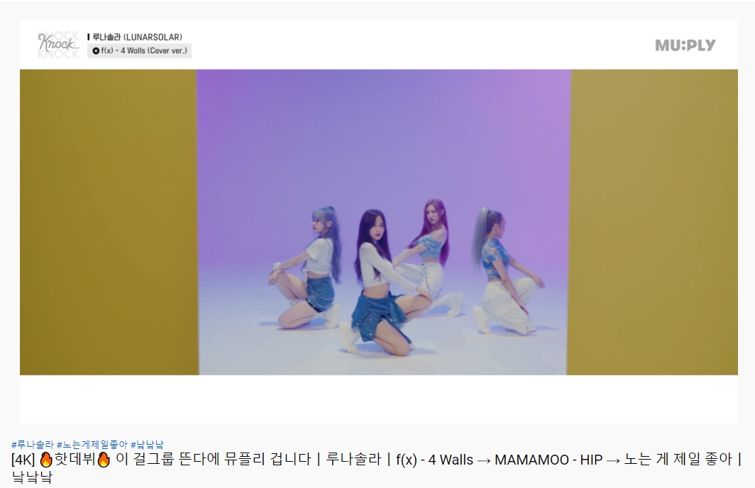 바로 루나솔라가 유튜브 채널 뮤플리에서 f(x)의 4 Walls와 마마무의 HIP을 커버했기 때문인데요, 이미 유튜브 댓글상에도 그룹명과 선곡의 접점에 대한 이야기들이 가득있었습니다. 반응들은 꽤나 긍정적이었는데요, '덕분에 f(x)가 한 번 더 언급되어서 좋다', '탁월한 곡 선택이다'라는 반응들이 주를 이었습니다. 아무튼 신인 걸그룹 루나솔라의 앞으로의 활동을 기대해보며, 오늘 소식은 여기까지입니다. 다음에 더 좋은 소식으로 돌아올게요. 감사합니다.