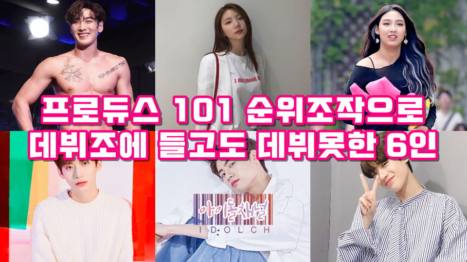 안녕하세요, 아이돌채널입니다. 프로듀스 101 순위조작으로 데뷔조에 들고도 데뷔못한 6인이 공개되었습니다. 그 주인공들은 바로 시즌2 강동호, 시즌3 이가은(실제 순위 5위), 한초원(실제 순위 6위), 시즌4 구정모(실제 순위 6위), 이진혁(실제 순위 7위), 금동현(실제 순위 8위)이었습니다. 이 외에도 생방송 이전투표에서 순위조작을 당한 6명의 피해자가 더 있다고 합니다.