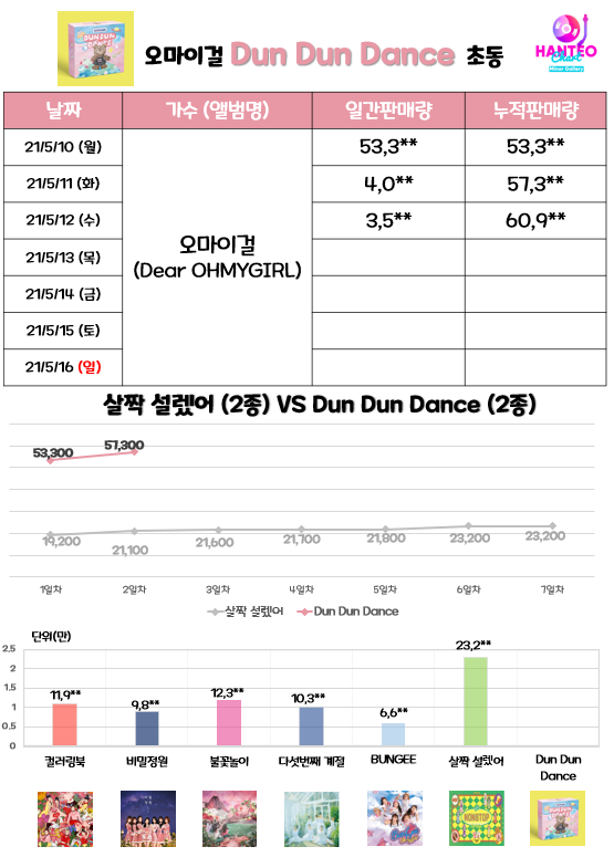 그것을 한 번 수치로써 확인해볼까요? 지난 살짝 설렜어 때는 앨범 초동 기록이 23,2**장에 그쳤습니다. 음원 성적에 비해서 조금 부진한 편이었죠. 하지만 이번 앨범 초동 집계 3일차인 현재는 60,9**장을 기록하며 오마이걸이 대세임을 입증하고 있습니다. 아직 초동 집계가 4일이나 남았다는 것을 생각해보면 아마 전작에 비해 3배 이상의 판매고를 올릴 수 있을 것으로 보이네요.