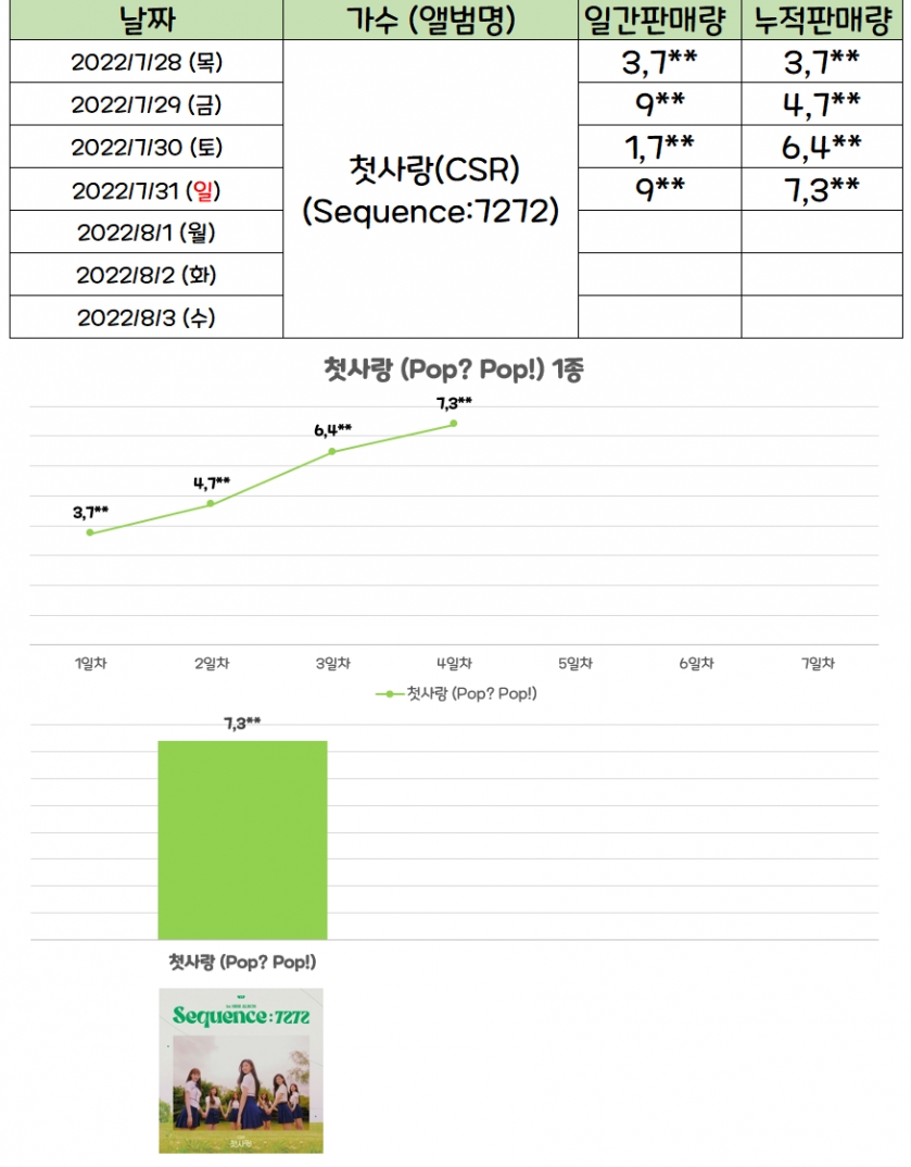 바로 위에 있는 차트는 첫사랑의 데뷔 앨범 초동인데요, 보시면 아시겠지만 데뷔 4일차인 어제까지의 앨범 판매고가 무려 7,300장입니다. 이제 막 데뷔한 신인 걸그룹인 점을 감안하면 높은 수치라 할 수 있겠습니다. 여러분도 걸그룹 첫사랑이 충분히 대성할 수 있을 것 같지 않나요? 저는 벌써부터 느낌이 좋은 것 같습니다. 오늘 소식은 여기까지입니다. 다음에 더 좋은 소식으로 돌아올게요. 감사합니다.