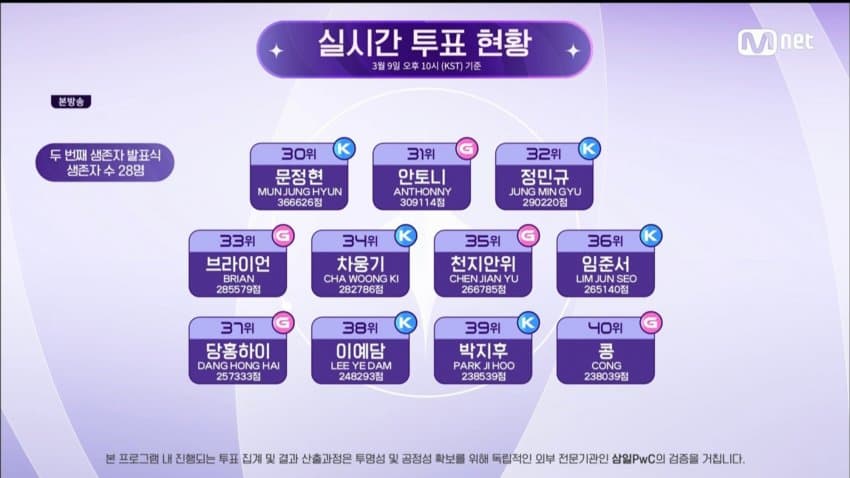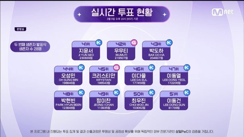 지난 1차 생존자 발표식 TOP9은 대부분 TOP9의 자리를 지킨 것으로 보입니다. 한편 가장 충격적인 순위 변화를 보여준 것은 이다을 연습생이 아닌가 싶은데요, 방송 전부터 귀여운 외모로 인기몰이에 성공하며 TOP9을 기록한 적이 있었던 그가 46위라는 탈락에 가까운 순위를 받았습니다. 이변이 없는 한 이다을 연습생은 이대로 탈락을 할 것으로 보이는데요, 위기를 극복할 기회가 올지는 지켜봐야겠습니다. 오늘 소식은 여기까지입니다. 다음에 더 좋은 소식으로 돌아올게요. 감사합니다.