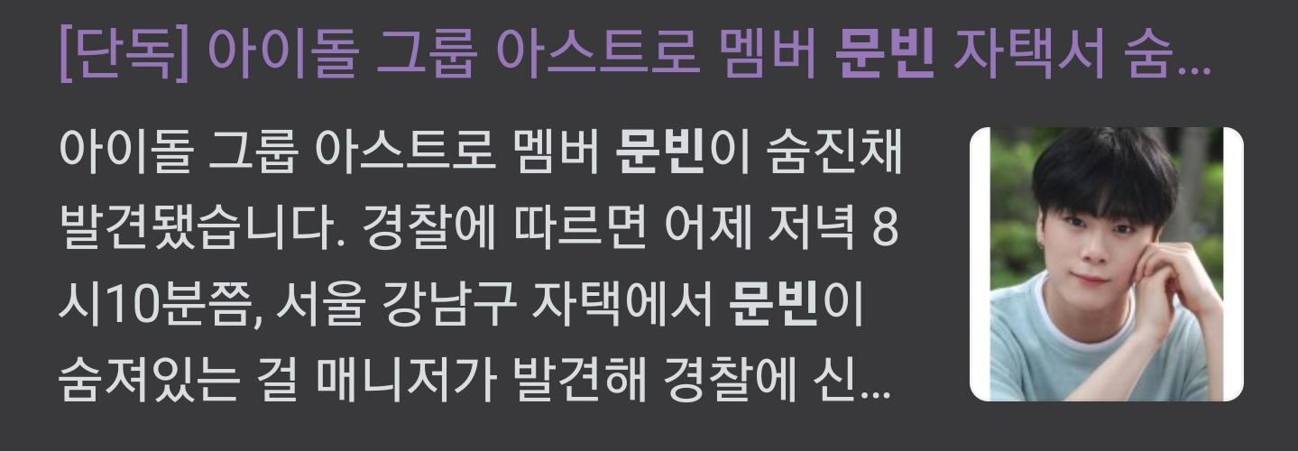 바로 어제 저녁 판타지오 소속 5인조 보이그룹인 아스트로의 멤버 문빈이 자택에서 사망한 채로 발견되었다고 합니다. 최초 발견자는 매니저로 그 시간은 20시 10분 경으로 알려졌습니다.